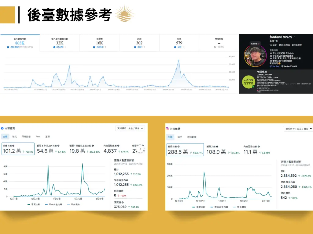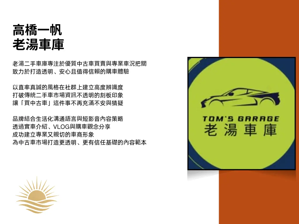 關於:老湯二手車庫專注於優質中古車買賣與專業車況把關致力於打造透明、安心且值得信賴的購車體驗以直率真誠的風格在社群上建立高度辨識度打破傳統二手車市場資訊不透明的刻板印象讓「買中古車」這件事不再充滿不安與猜疑品牌結合生活化溝通語言與短影音內容策略透過實車介紹、VLOG與購車觀念分享成功建立專業又親切的車商形象為中古車市場打造更透明、更有信任基礎的內容範本