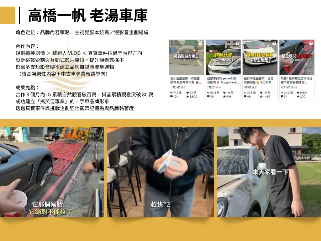 合作內容:規劃搞笑劇情 × 藏鏡人 VLOG × 真實事件拍攝等內容方向 設計挑戰企劃與互動式影片橋段,提升觀看完播率 撰寫多支短影音腳本建立品牌自媒體流量邏輯 (結合娛樂性內容+中古車專業轉譯導向)